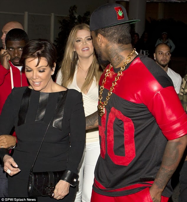 Wearing a little black dress with over-the-knee boots, 58-year-old Kris was seen being guided out of the club in the early hours of Tuesday morning, holding hands with The Game, real name Jayceon Terrell Taylor, and Khloe's BFF Malika Haqq. See more photos after teh cut...